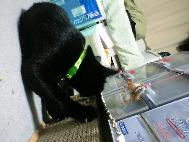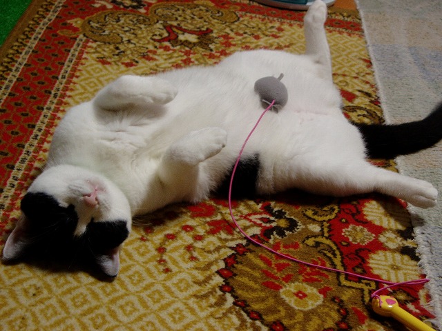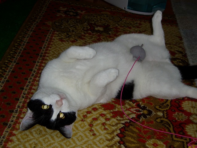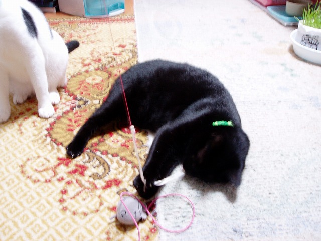 今日のうちにたくさんUPしておこうと思いました。 まりんの視線の先は、 もみっち遊ぶ。 まりんも同じものが好きなので、遠慮しているのだが、本心は遊びたいのだ。(←下僕が勝手に思っている) 一つのおもちゃを2猫で、という事がないので、片方が遊んでるとも片方が見ている。 下僕一人で、2猫とも遊ばせようとするのはなかなか大変だ。 まりんはお腹見せることが多い。(もみはほとんどない) でも、なんか乗ってるよ。 おもちゃ乗ってるよ。 きお