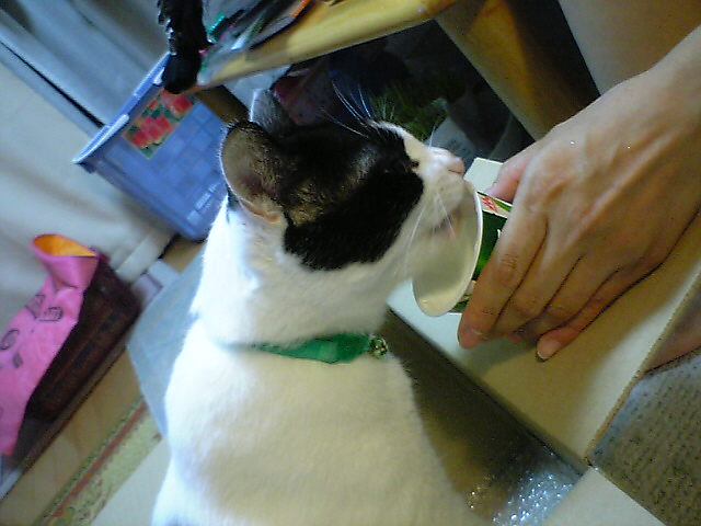 自分の食べ終わったヨーグルトをあげるきお。