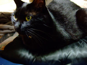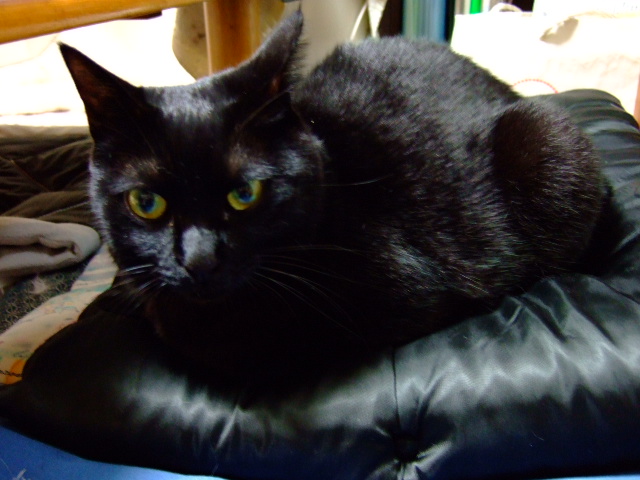 真っ黒い座布団の上に真っ黒いもみっち。