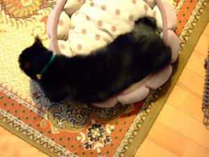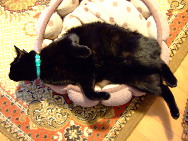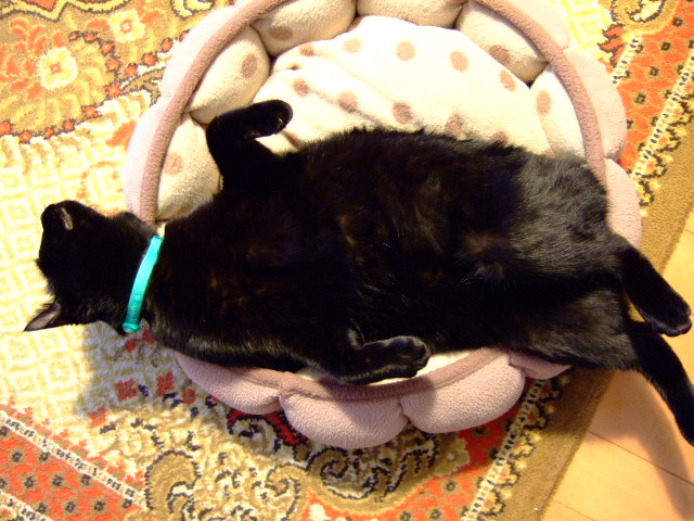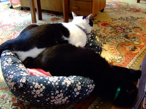 一見、仲良く猫ベッドでまどろむ、まりんともみっち……。
